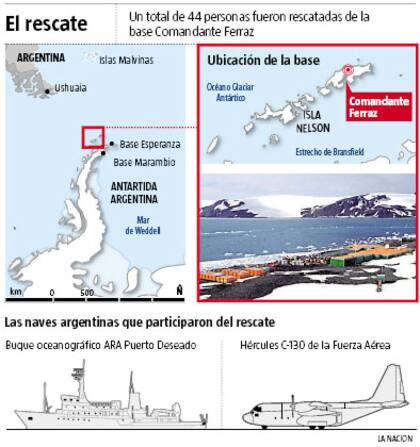 El operativo de evacuación, del que participó la Armada argentina, alcanzó a unas 44 personas, según un comunicado de la Marina brasileña. La Armada argentina destinó al buque oceanográfico Puerto Deseado, en la zona como parte de la Campaña Antártica de Verano, y el transporte Canal Beagle, además de un avión Hércules C-130 de la base Marambio. También brindaron asistencia una nave polaca con personal de la base Arctowski y tres helicópteros de la base chilena Frei. La Fuerza Aérea Brasileña envió un avión hacia Punta Arenas para trasladar al personal que fue evacuado de la base.
