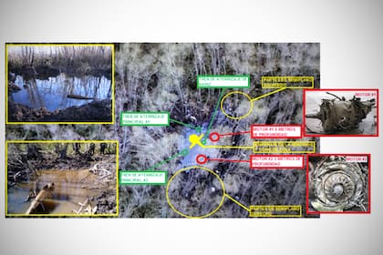 "La zona de impacto de la aeronave estaba concentrada en un cráter de aproximadamente 80 m2, cubierto de agua, y con una dispersión de restos que abarcaba una circunferencia de 50 metros de radio. Tras la autorización de la autoridad judicial a cargo, el Etic comenzó con las labores de campo. Dividió en sectores el perímetro alrededor de la zona de impacto, relevó y fotografió todos los restos de la aeronave en su posición final", explica el documento.