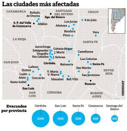 La situación más crítica se registró ayer en Córdoba, donde el gobernador De la Sota aseguró que se trata del peor desastre en cincuenta años; las otras afectadas son Santa Fe, Santiago del Estero, San Luis y Catamarca,