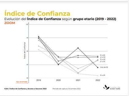 Ese freno, según se explicó, es a expensas de que la confianza se mantiene estable (en 87,7 puntos) en los adultos de entre 41 y 50 años y volvió a descender en los mayores de 65, aunque más levemente (8%) que entre los adolescentes y los jóvenes. De 94,9 puntos de confianza en 2019, el índice bajó a 83,9 puntos entre los adultos mayores el año pasado, tras un repunte de 85 a 91,2 entre 2020 –cuando todavía no había arrancado la campaña de vacunación para Covid-19– y 2021.