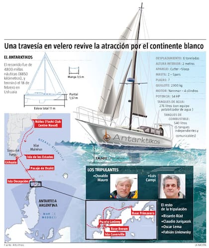 Dos amigos argentinos, Osvaldo Mauro, ingeniero en sistemas, y Luis Campi, abogado, ambos de 54 años, se propusieron hace una década tocar suelo antártico, y para ello construyeron un velero especial. Luego de recorrer 4800 millas náuticas en una expedición de más de dos meses, en los que debieron soportar temperaturas bajo cero, fuertes vientos y esquivar hielos, el Antarktikos -nombre de la embarcación- amarró, el sábado pasado, en el puerto de Ushuaia, punto final de su aventura.