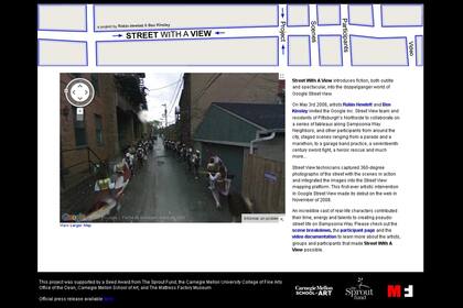Street With a View es algo más que un simple divertimento; según sus creadores, es una intervención artística. Robin Hewlett y Ben Kinsley invitaron al equipo de Street View y a los vecinos de la ciudad de Pittsburgh, en EEUU, a que recreen escenas peculiares que serían tomadas por las cámaras de Google y posteriormente subidas a Internet. El resultado es una serie de situaciones muy singulares.