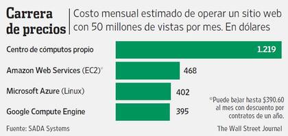 Detrás del crecimiento de la computación en la nube están los ahorros que genera. Un sitio web de tamaño medio, con unos 50 millones de vistas al mes, gastaría alrededor de US$1.200 mensuales para comprar dos servidores, el hardware para enviar datos a la web y otros equipos, según los cálculos de Simon Margolis, de la consultora de tecnología SADA Systems. La misma empresa pagaría entre US$270 y US$530 para alquilar una potencia informática equivalente a Amazon, Microsoft o Google, dice el analista.
