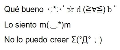 El emoticón (^_^) representa la idea de alegría, el emoticón (;_;) la de tristeza, etc. La relación entre el ícono y el significado es tan directa que hoy la gente se familiariza con estos para expresarse de manera rápida e informal. Como las onomatopeyas japonesas que acompañan a los dibujos manga, los emoticones también pueden dinamizar la composición.