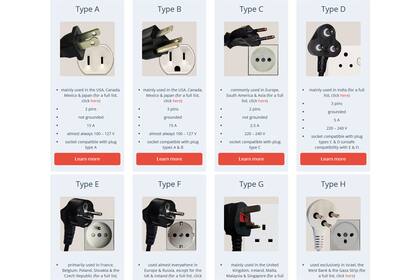 Por ejemplo, España usa una ficha tipo F, y también utiliza el tipo C, que coincide con la utilizada en la Argentina, pero que está en franco retroceso frente al toma tipo I, conocido en la jerga como el conector de "tres patitas", mientras que Estados Unidos emplea enchufes tipo A y B. A su vez, también hay que tener el voltaje empleado en cada destino.