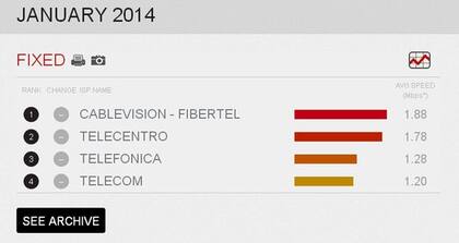 De acuerdo a las mediciones del mercado argentino, Fibertel tiene una velocidad promedio de 1,88 Mbps, seguido por Telecentro con 1,78 Mbps. Por su parte, los servicios de ADSL de las operadoras Telefónica y Telecom se ubican en 1,28 y 1,20 Mbps en promedio, respectivamente.