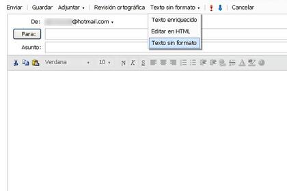 5- Cuerpo del mensaje. Aquí es donde se escribirá el mensaje. En los servicios de correo web de uso extendido se encuentra activada la opción "Texto enriquecido", que permite remarcar el texto en negrita y cambiar el color o tamaño de la fuente, por ejemplo. Si no se desea hacer uso de estas características, se podrá optar por la alternativa denominada "Texto sin formato".