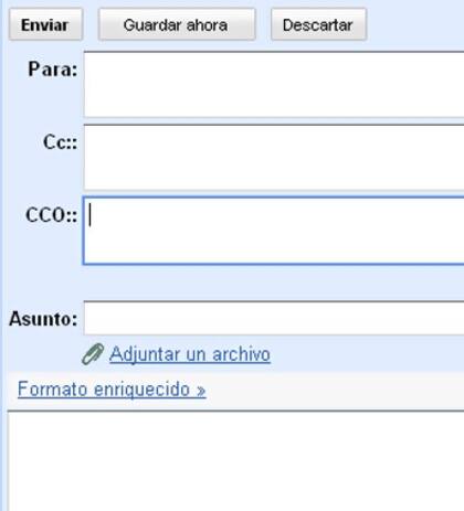4- Con Copia o copia oculta. Estas opciones se pueden activar con un simple click, generalmente bajo la leyenda Mostrar CC: y CCO: .