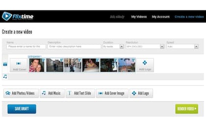 Algunos sitios como Flixtime ofrecen una opción simple: que el usuario seleccione hasta un máximo de 15 fotografías y una pista de audio, y automáticamente se genera un video dinámico, con distintas transiciones, de hasta un minuto de duración. Se puede exportar en alta definición y guardarlo en la computadora. También es posible compartirlo en Facebook y Twitter. Lo mejor de todo es que no requiere de la instalación de ningún programa en la computadora y los videos también pueden "embeberse" en una página personal.