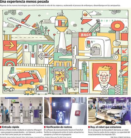 Aeropuertos en distintas partes del mundo avanzan en esta dirección. En el Aeropuerto Gatwick de Londres, balizas de localización lo identifican a través de su smartphone y le indican cómo llegar a su puerta de embarque, al estilo de un GPS, señalando por el camino lugares de comida y tiendas. En Düsseldorf, Alemania, robots estacionan su auto cuando parte o lo llevan de vuelta a la acera cuando aterriza, vinculando su itinerario con la placa del vehículo. Investigadores están desa-rrollando robots capaces de despachar las maletas y devolverlas a los pasajeros minutos después del aterrizaje.