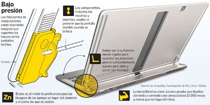 "La bisagra es la clave para hacer que funcione", dice Jeff Barney, subdirector de computadoras personales de Toshiba. Una mala bisagra, añade, "es el talón de Aquiles de una computadora portátil".