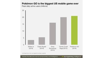 Y según la consultora Survey Monkey, especializada en el análisis de datos de usuarios de videojuegos, alcanzó el pico de más de 20 millones de usuarios activos en Estados Unidos, superando al Candy Crush Saga, Draw Something, Clash Royale y Slither.io.