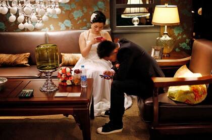 La imagen de arriba pertenece al fotógrafo barilochense Carlos Barría, y muestra a una pareja china a punto de casarse en un casamiento múltiple en un centro comercial de Shanghai, con el objeto de promocionar la institución del matrimonio.