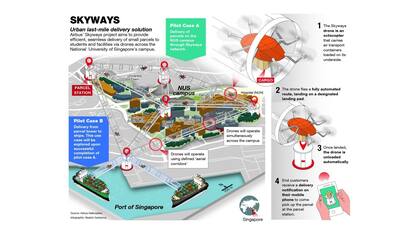 Estos nuevos drones estibadores ya se están probando en Singapur y forman parte del programa Skyways Project firmado con la autoridad de aviación civil del país asiático. El aparato, del tipo octocóptero (ocho alas rotatorias), recoge la carga del contenedor, la porta en su parte inferior, y vuela hasta su destino por pasillos aéreos predeterminados. La capacidad de carga está entre dos y cuatro kilogramos, y los aparatos están programados para recargar sus baterías automáticamente.