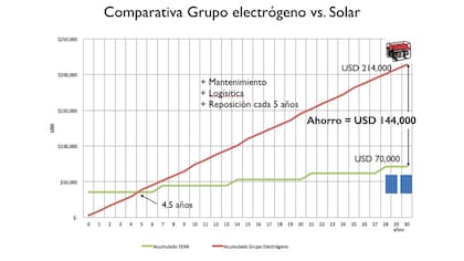 A niveles de potencia similares, la inversión inicial sería de 2835 dólares para un grupo electrógeno y 35.000 dolares la instalación de energía solar fotovoltaica.