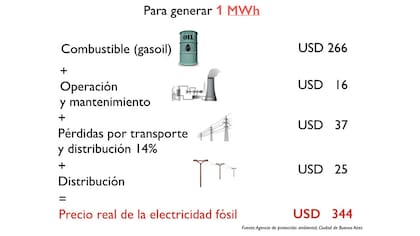 Sin embargo, es difícil que esto ocurra. Según un análisis de la Agencia de Protección Ambiental de la Ciudad de Buenos Aires (APRA), cada MWh que se suma al país (de fuentes de centrales térmicas) le cuesta 344 dólares.