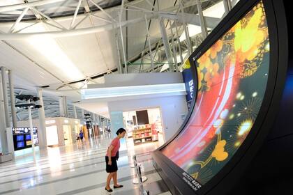 Una mujer observa la mayor pantalla de plasma del mundo, de 200 pulgadas y creada por la compañía Shioda Plasma, colocada en el aeropuerto internacional Kansai en Osaka, Japón