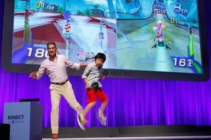 El gerente de Entretenimiento de Microsoft Japan, Takashi Sensui, salta junto a un niño en la llegada oficial de la consola Xbox 360 junto al dispositivo Kinect al mercado nipón