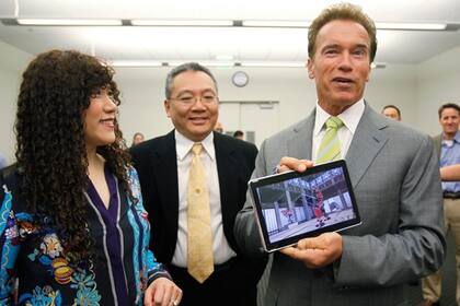 El gobernador de California Arnold Schwarzenegger posa con un dispositivo con chip Marvell en la sede de la compañía en Santa Clara
