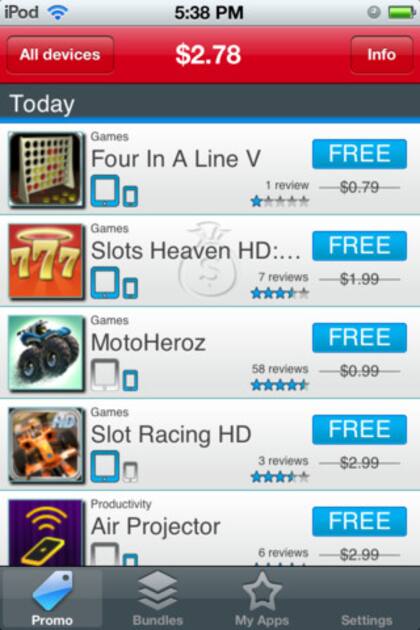 Para iPhone, iPod touch y iPad existen varias aplicaciones de este tipo; entre ellas está App Promo , que permite descubrir las novedades y las mejores promociones de la tienda on line de Apple en todas las categorías. Con una propuesta similar, Free Report permite ver de forma diaria las aplicaciones sin costo que se ofrecen en el App Store.