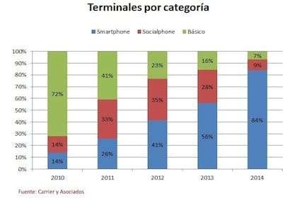 Aunque el país cerró 2014 con una reducción en las ventas de teléfonos, el parque de equipos viró decididamente hacia los teléfonos inteligentes: según estimaciones de la consultora Carrier y Asociados, el 84 por ciento de los teléfonos celulares vendidos en el país en 2014 fue un smartphone. En 2013 los teléfonos inteligentes conformaban sólo el 56 por ciento de las ventas.