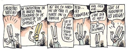 Por su parte, el dibujante Liniers aprovechó la ocasión para utilizar la tira cómica diaria para decir que Hollywood lo contrató como guionista de la serie Los Simpsons. "Que la inocencia les valga", finaliza el autor en la última viñeta.