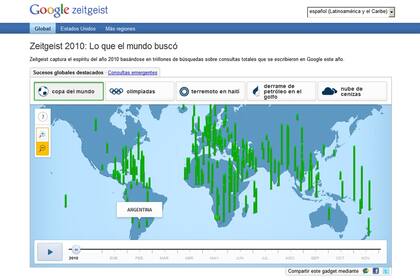 La Copa del Mundo, el terremoto de Haití y Chile junto al rescate de los mineros en el país trasandino son sólo algunas de las consultas más realizadas por los usuarios de Internet en Google. Para ello, la compañía publicó su habitual reporte Zeitgeist para 2010, con una serie de listas que busca reflejar el pulso del año en diversas búsquedas web que se realizaron durante este año.