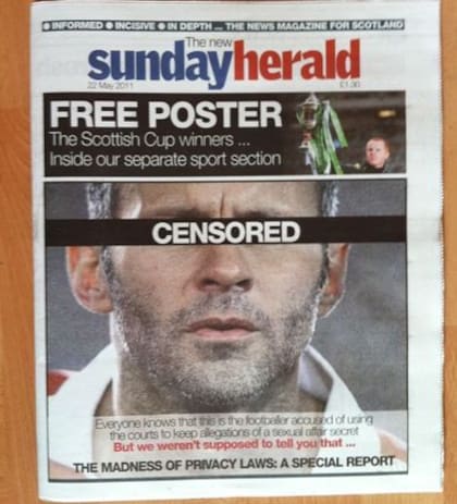 Por su parte. el Sunday Herald consideró ridículo que no pudiese mencionar al futbolista, a raíz de una demanda judicial, después de que diversos sitios de Internet sí lo hicieron, por lo que rompió el embargo que pesaba sobre la noticia. De esta forma, el periódico mostró en su portada el rostro del jugador en cuestión con una faja sobre sus ojos y la palabra "censura" , pero se ve claramente que se trata de Giggs, jugador símbolo no sólo de Gales, sino del poderoso campeón inglés.