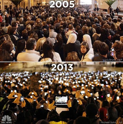 La velocidad con la que avanza la tecnología es muchas veces difíciles de dimensionar. Sin embargo, dos fotos que fueron divulgadas luego la elección de Francisco como nuevo Papa muestra lo vertiginosos que son los avances en la comunicación. La primera -en 2005- corresponde al momento de cuando fue elegido Benedicto XVI. La segunda, en la que se ven cientos de celulares levantados, ocurrió la semana pasada en el momento que Jorge Bergoglio saludó por primera vez como sumo pontífice. La comparación la hizo