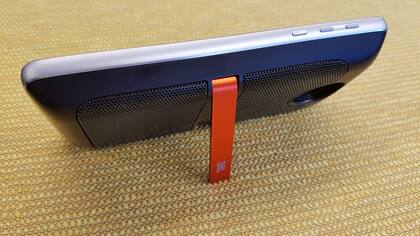 La cámara es el único elemento que sobresale del dorso del equipo, y por un motivo: es uno de los puntos de anclaje de los accesorios (más sobre eso, abajo). El Moto Z Play tiene también un flash frontal para complementar la cámara de 5 megapixeles (f/2.2 con un gran angular de 85 grados); el flash ayuda a lograr autofotos bien iluminadas, pero no mucho más. La cámara ahora incorpora un modo de control manual que funciona muy bien.