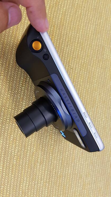 Lenovo hizo un módulo de cámara junto a Hasselblad. No es como el accesorio del LG G5 o la funda del Lumia 1020, que sólo agregan un botón de disparo y un grip para facilitar el agarre del teléfono. Aquí se trata de una cámara completa, con su propio sensor de 12 megapixeles (1/2,3 pulgadas), botón de disparo de dos tiempos (para hacer foto y tomar la imagen), perilla para hacer un acercamiento con el zoom óptico de 10 aumentos y flash Xenón. De hecho, el teléfono lo único que provee es la energía, el almacenamiento y la pantalla para funcionar como visor. Tiene su propio estabilizador óptico para las fotos (la cámara del Moto Z Play no); los videos son estabilizados en forma electrónica. Conceptualmente está más cerca de los accesorios de Sony y Kodak (que funcionan además con cualquier marca de teléfono).