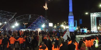 El discurso de Cristina Fernández fue en la entrada de la exposición, justo debajo de una gigante Constitución, una balanza que evoca la Justicia, un hombre que rompe las cadenas en llamado a la libertad y varias urnas que celebran la democracia.