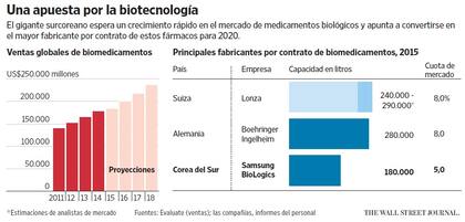 Las ventas mundiales de fármacos biológicos ascenderán de US$184.000 millones este año a US$278.000 millones en 2020, proyecta la firma de investigación londinense Evaluate Ltd. A pesar de que la cifra representa sólo un tercio de las ventas ac-tuales de medicamentos convencionales (sintetizados químicamente), los fármacos biológicos ofrecen mayores márgenes de ganancia, según los analistas. Estimaciones internas de Samsung consideran que los ingresos derivados de la fabricación de remedios biológicos pasarán de US$28.000 millones este año a US$42.000 millones en 2020.