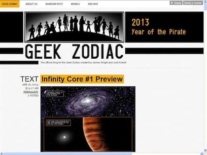 ¿Aburrido de la astrología clásica? ¿Desconcertado ante las predicciones mayas? ¿Incrédulo respecto del horóscopo chino? Afortunadamente, existe el Zodíaco Geek, una mancia tecno desarrollada por James Wright y Josh Ecker. Enmarcados en el Año del Pirata (elemento Fuego), los nativos de los nuevos doce signos (Robot, Alien, Mago, Ninja y Zombie, entre otros) podrán obtener descripciones, música asociada, comics y predicciones gratuitas vía Twitter ( @geekzodiac ), Facebook ( https://www.facebook.com/geekzodiac#!/geekzodiac ) y Tumblr ( http://geekzodiac.tumblr.com ).