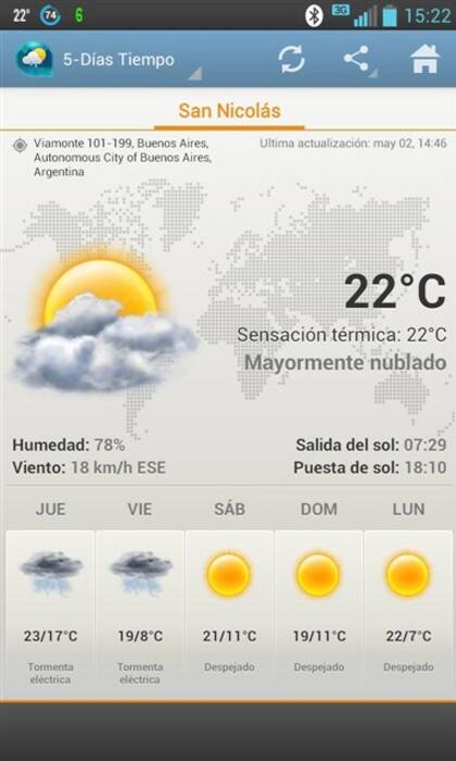 Hay muchas buenas apps que informan el estado del tiempo en Android, cada una con sus pros y contras. Entre las que permiten visualizar el estado del tiempo y el pronóstico de forma simple y clara en cualquier tamaño de pantalla está Android Weather. Su widget (la ventana activa que muestra el tiempo en el display del smartphone) está entre los pocos que combinan buen diseño con abundancia de información: ubicación, fecha, hora, humedad, temperatura, sensación térmica, viento y cobertura nubosa. La versión gratis muestra publicidad.