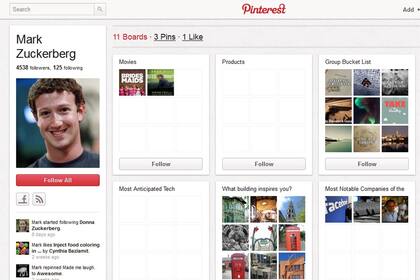 Además de ser la plataforma de moda de las últimas semanas, Pinterest llamó la atención de Mark Zuckerberg, que registró una cuenta en el sitio que permite republicar contenidos en diferentes tableros. Al momento, el CEO y cofundador de Facebook cuenta con 4500 seguidores, y también se encuentra presente en Google+ , Twitter y, por supuesto, en la red social que ya cuenta con 845 millones de usuarios en todo el mundo.