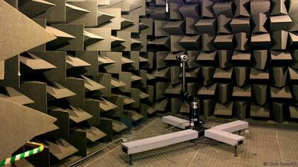 Una de las instalaciones clave, sin embargo, es una cámara anecoica. En este cuarto, las paredes, el techo y el piso (por debajo de tela metálica sobre la cual la gente se puede parar) están cubiertos en gruesas cuñas de gomaespuma. Las ondas de sonido desaparecen en las ranuras entre esas cuñas y son absorbidas muy efectivamente. De ahí el nombre "anecoica" (anti-eco).