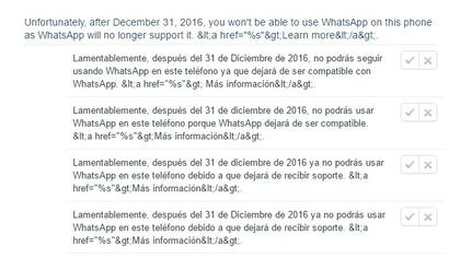 Esta semana apareció, en el sitio de traducción voluntaria de Whatsapp , el texto que alertará a los usuarios de teléfonos con Android 2.1 o 2.2 que, efectivamente, el servicio de mensajería instantánea cesará su funcionamiento en ese dispositivo. Esto afectará a un grupo reducido de usuarios; se trata de versiones que debutaron a principios de esta década.
