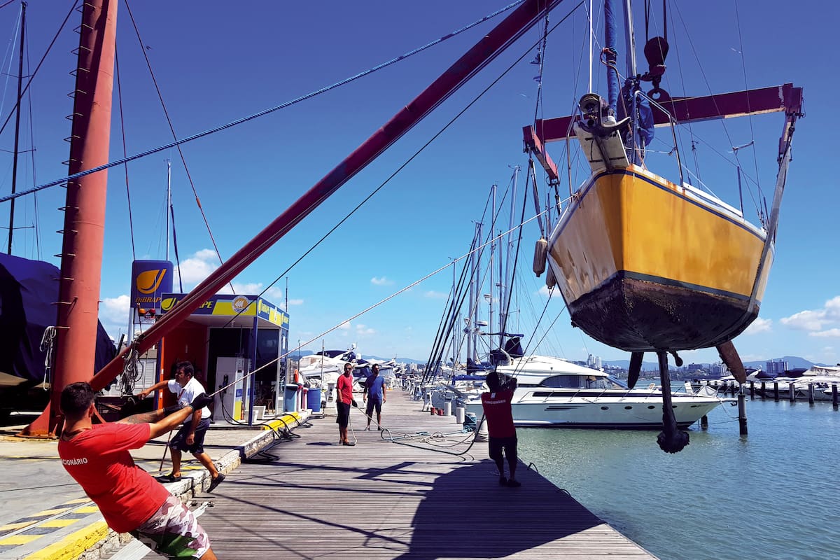 Para lijar y pintar con antiincrustante el fondo del barco habíamos reservado la sacada a tierra desde Buenos Aires. Corría el septiembre más lluvioso de la historia de Florianópolis (literal, llovieron 20 días del mes), cuando por arte de conjuros y ofrendas que le hicimos al sol, el cielo se abrió y nos dio tres jornadas completas de buen tiempo. El Tangaroa 2 pesa unas 6 toneladas, dato clave para calcular la resistencia de los zunchos que se iban a poner en la pluma para levantarlo del agua, hacerlo girar en el aire y depositarlo en una carreta de madera. Esta maniobra siempre implica un momento de tensión. Juan lo pasó arriba del barco, por cualquier cosa, aunque no pudiera resolver nada. Con Ulises preferimos mirar para otro lado.