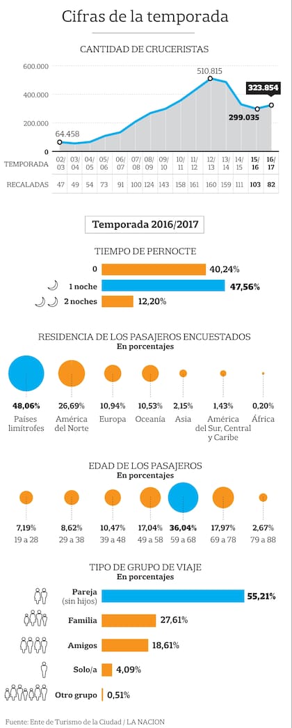 "Esta temporada arribaron a la ciudad 25 buques, que realizaron un total de 82 recaladas. El 40,24% de estos buques, considerando todas sus recaladas, no pernoctó en la Capital, mientras que el 47,56% permaneció una noche y el 12,20% lo hizo dos noches", indica un informe realizado por el Observatorio de Turismo de la Ciudad, que arroja que la franja etaria preponderante a bordo de cruceros es de entre 59 y 68 años.