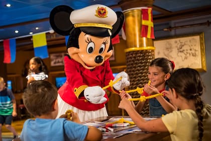 Ya se sabe que en los parques de Disney, cuando aparece un personaje automáticamente se crea una cola. Pero en el crucero, la experien-cia es distinta. Si bien por ser famosas figuras, tienen sus puntos de aparición anun-ciados donde uno puede hacer la cola para la foto y el autógrafo (eso sucede en general en el salón principal), también deambulan abordo, aparecen intempestivamente en los clubs para chicos, o desembarcan en malla en la isla de Castaway.