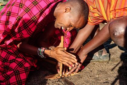 Después de bailar me mostraron como hacen el fuego. Todos los días a la mañana encienden un fuego que después se distribuye en las casas. La forma es frotar la rama de un árbol con la base de otro sobre un cuchillo. Lleva unos cinco minutos y se van turnando. Finalmente empieza a aparecer el humo y se enciende la brasa. Nunca había visto que alguien haga fuego de esta manera.