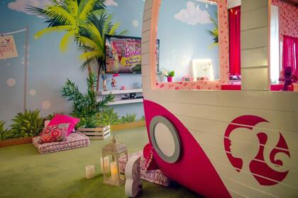 En el primer piso, a lo lejos, ya se ve la puerta 136 ploteada a todo color que anuncia que es una habitación diferente: adentro el cuarto, completamente intervenido tiene una especie de casa rodante, con la cama en altura y llena de accesorios de la famosa muñeca que festeja los 60 años: cocina. En el baño amenitties, como toallas, jabones y cepillos de dientes todo del mundo Barbie. El guardarropas está colmado de vestidos para disfrazarse y por supuesto la gran colección de muñecas está disponible para jugar toda la estada, incluso de noche, porque nadie quiere dormir.
